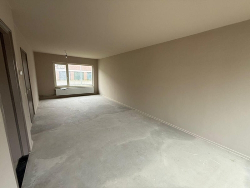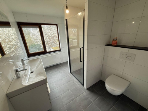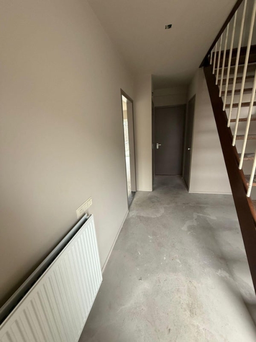 Hal met vernieuwd toilet en toegang tot de keuken en de woonkamer. Ruime en lichte woonkamer met aan de achterzijde een schuifpui naar de tuin.